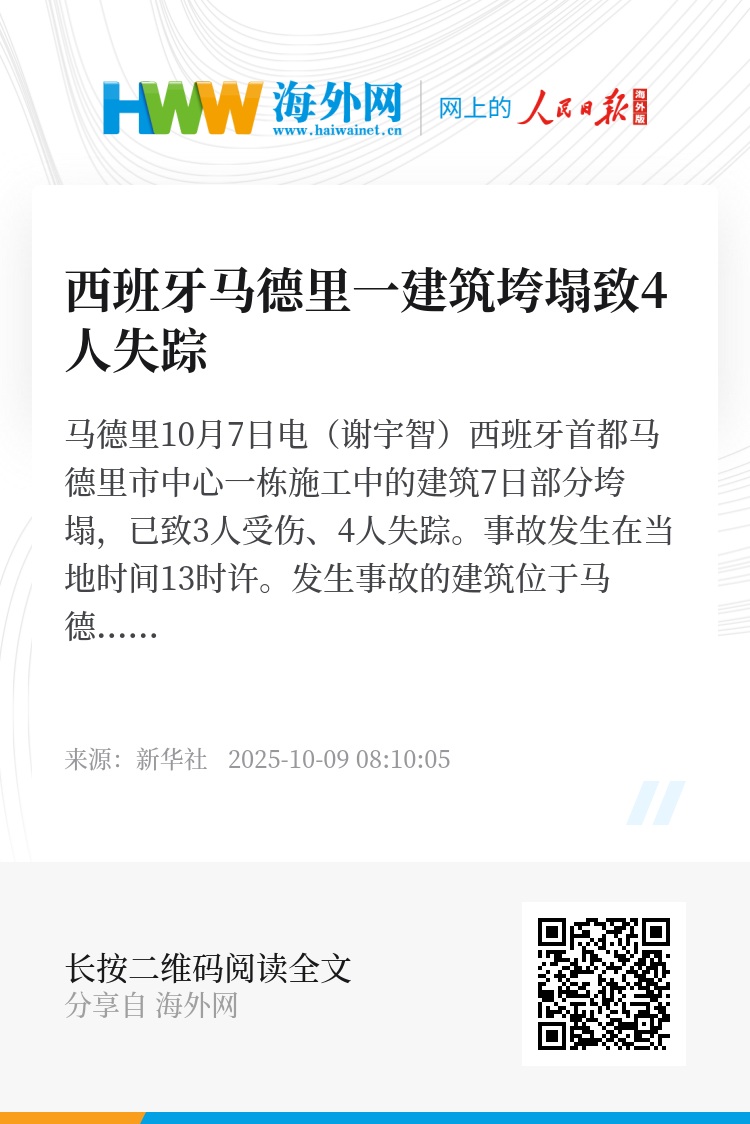 新华社马德里10月7日电(谢宇智)西班牙首都马德里市中心一栋施工中的建筑7日部分垮塌,已致3人受伤、4人失踪。