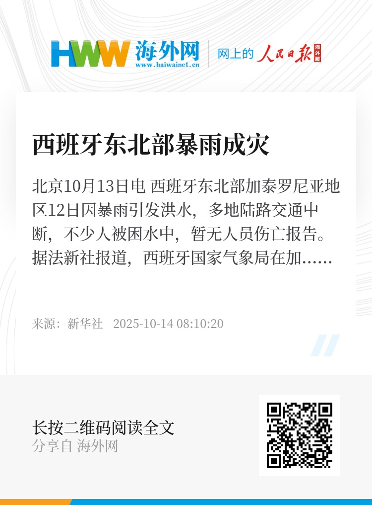新华社北京10月13日电 西班牙东北部加泰罗尼亚地区12日因暴雨引发洪水,多地陆路交通中断,不少人被困水中,暂无人员伤亡报告。