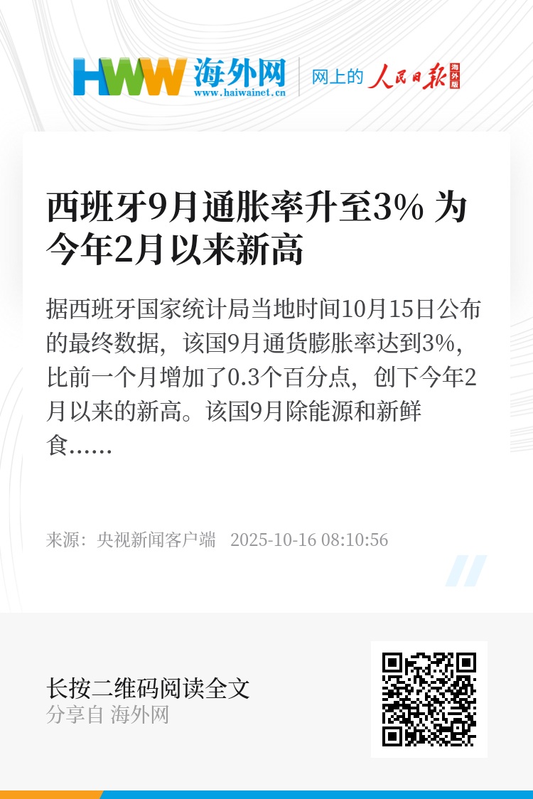 据西班牙国家统计局当地时间10月15日公布的最终数据,该国9月通货膨胀率达到3%,比前一个月增加了0.3个百分点,创下今年2月以来的新高。该国9月除能源和新鲜食品外的核心通胀率为2.4%,与前一个月持平。