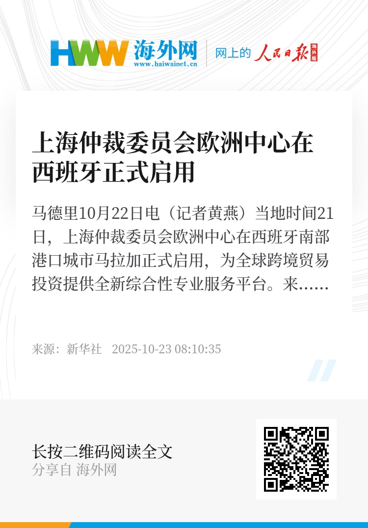 新华社马德里10月22日电(记者黄燕)当地时间21日,上海仲裁委员会欧洲中心在西班牙南部港口城市马拉加正式启用,为全球跨境贸易投资提供全新综合性专业服务平台。