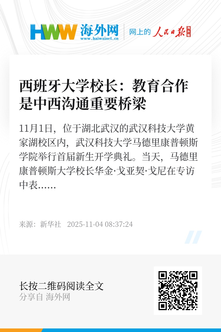 11月1日,位于湖北武汉的武汉科技大学黄家湖校区内,武汉科技大学马德里康普顿斯学院举行首届新生开学典礼。当天,马德里康普顿斯大学校长华金·戈亚契·戈尼在专访中表示,希望通过合作办学,创建一座连接中西两国历史文化和知识体系的桥梁。