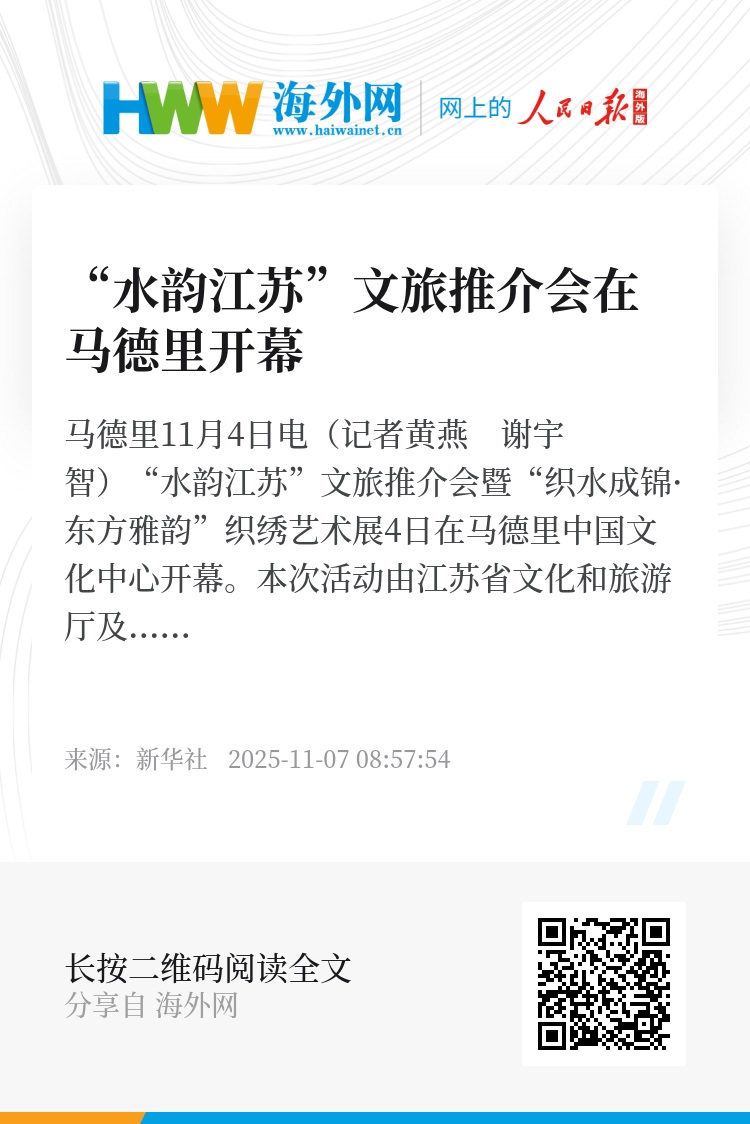 新华社马德里11月4日电(记者黄燕 谢宇智)“水韵江苏”文旅推介会暨“织水成锦·东方雅韵”织绣艺术展4日在马德里中国文化中心开幕。