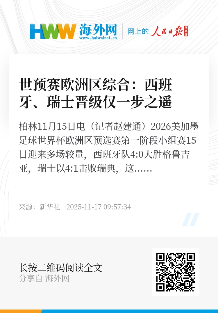 新华社柏林11月15日电(记者赵建通)2026美加墨足球世界杯欧洲区预选赛第一阶段小组赛15日迎来多场较量,西班牙队4:0大胜格鲁吉亚,瑞士以4:1击败瑞典,这两支获胜球队基本锁定直接晋级世界杯正赛的名额。