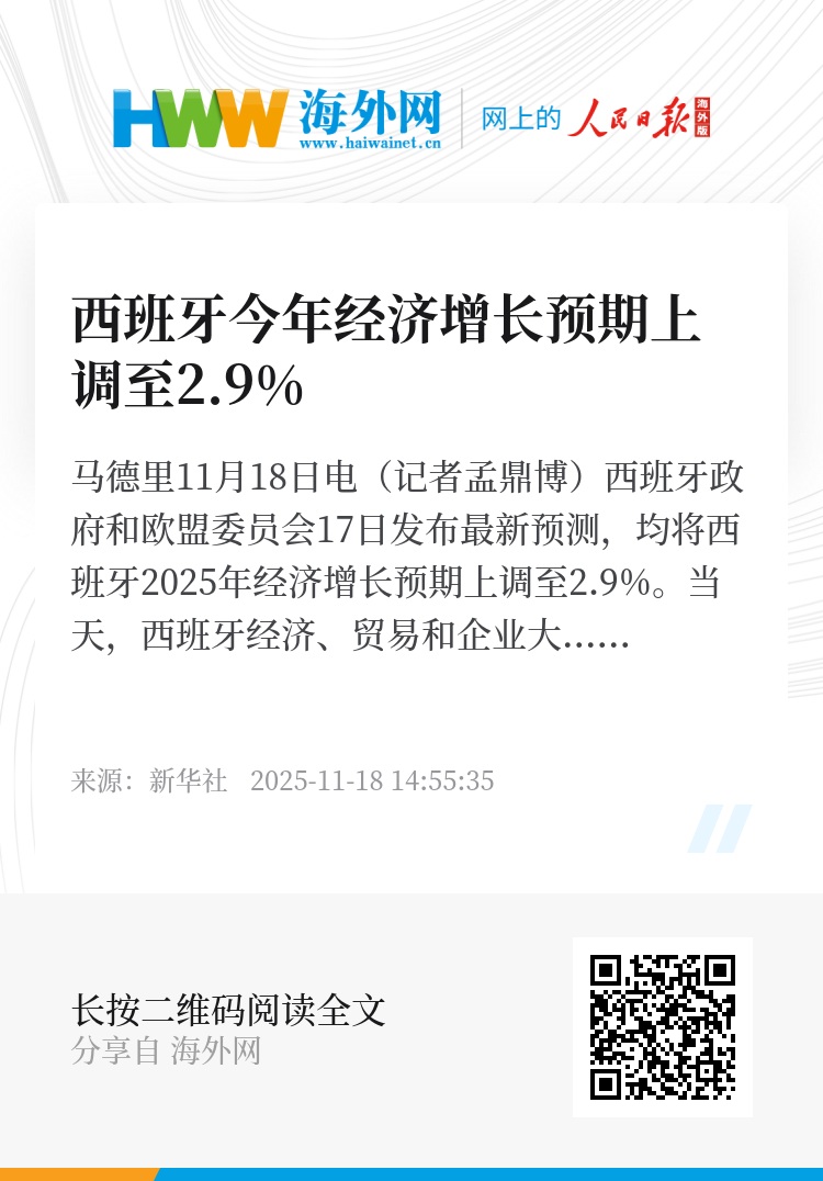 新华社马德里11月18日电(记者孟鼎博)西班牙政府和欧盟委员会17日发布最新预测,均将西班牙2025年经济增长预期上调至2.9%。