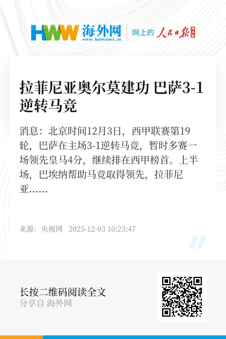 央视网消息:北京时间12月3日,西甲联赛第19轮,巴萨在主场3-1逆转马竞,暂时多赛一场领先皇马4分,继续排在西甲榜首。
