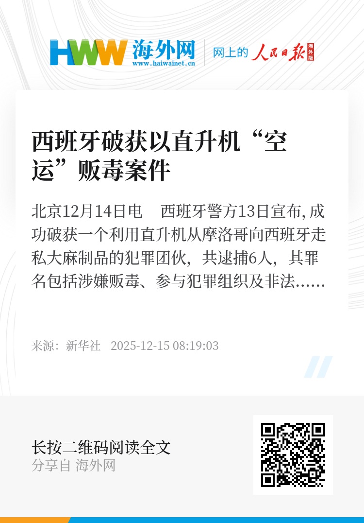 路透社13日援引警方消息人士的话报道,直升机易被发现且在黑市很难买到,因此“用于走私毒品实属罕见”。据法新社报道,过去一年间,西班牙警方还破获了利用无人机从摩洛哥向西班牙运送毒品的犯罪网络。(乔颖)