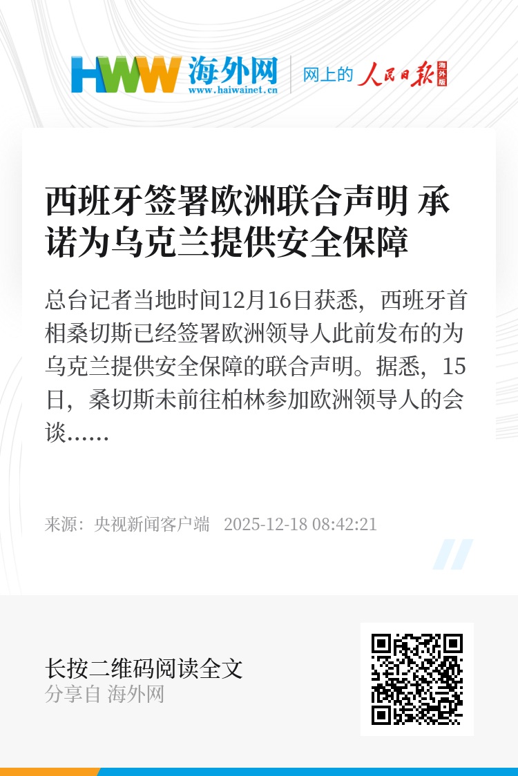 总台记者当地时间12月16日获悉,西班牙首相桑切斯已经签署欧洲领导人此前发布的为乌克兰提供安全保障的联合声明。