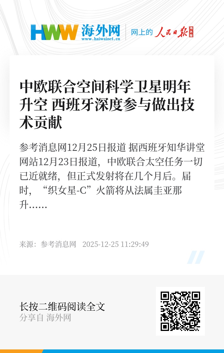 参考消息网12月25日报道 据西班牙知华讲堂网站12月23日报道,中欧联合太空任务一切已近就绪,但正式发射将在几个月后。届时,“织女星-C”火箭将从法属圭亚那升空,将中欧合作的太阳风-磁层相互作用全景成像卫星(SMILE)送入太空。