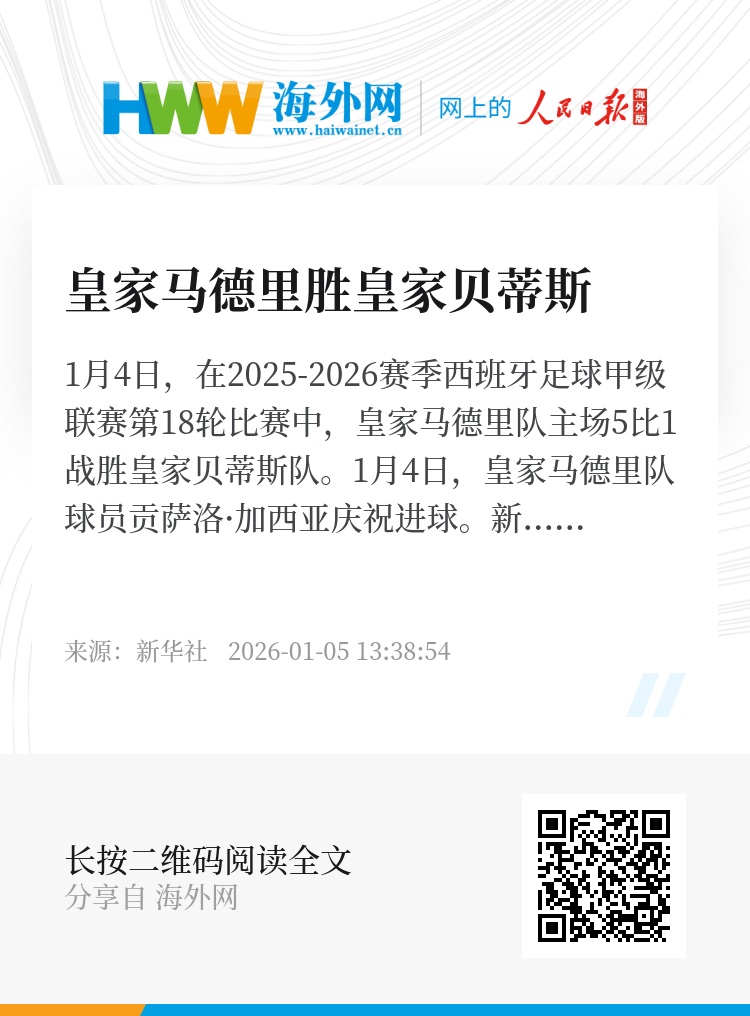 1月4日,在2025-2026赛季西班牙足球甲级联赛第18轮比赛中,皇家马德里队主场5比1战胜皇家贝蒂斯队。