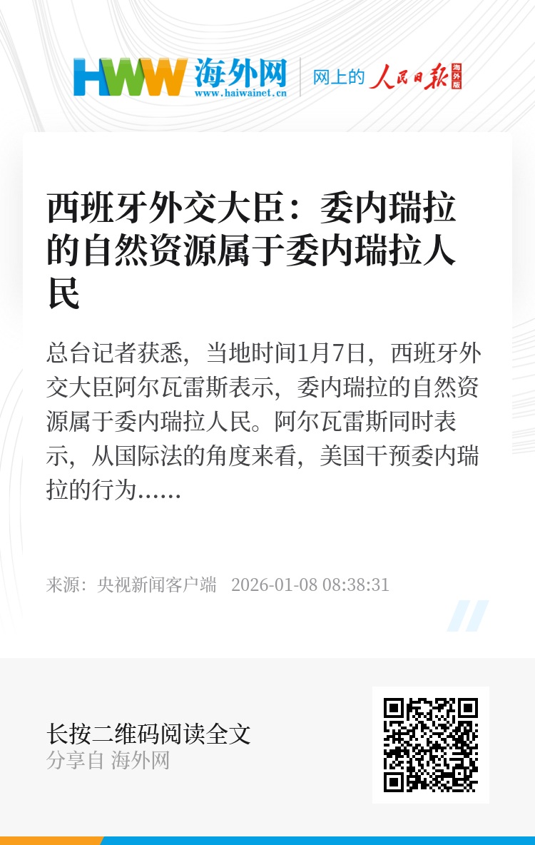 总台记者获悉,当地时间1月7日,西班牙外交大臣阿尔瓦雷斯表示,委内瑞拉的自然资源属于委内瑞拉人民。阿尔瓦雷斯同时表示,从国际法的角度来看,美国干预委内瑞拉的行为是非法的。