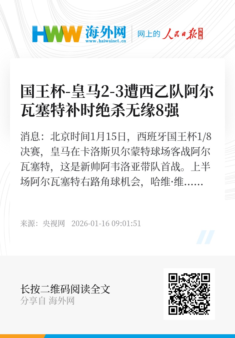 央视网消息:北京时间1月15日,西班牙国王杯1/8决赛,皇马在卡洛斯贝尔蒙特球场客战阿尔瓦塞特,这是新帅阿韦洛亚带队首战。上半场阿尔瓦塞特右路角球机会,哈维·维拉头球破门,补时最后时刻马斯坦托诺补射扳平,皇马暂1-1阿尔瓦塞特;下半场贝坦科尔破门,贡萨洛·加西亚绝平,贝坦科尔读秒绝杀,皇马2-3阿尔瓦塞特,无缘晋级8强。
