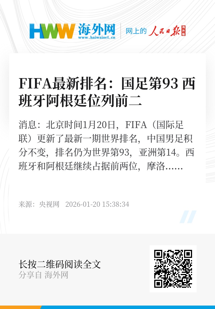 央视网消息:北京时间1月20日,FIFA(国际足联)更新了最新一期世界排名,中国男足积分不变,排名仍为世界第93,亚洲第14。西班牙和阿根廷继续占据前两位,摩洛哥凭借非洲杯亚军的表现升至世界第8,创造了队史新高。