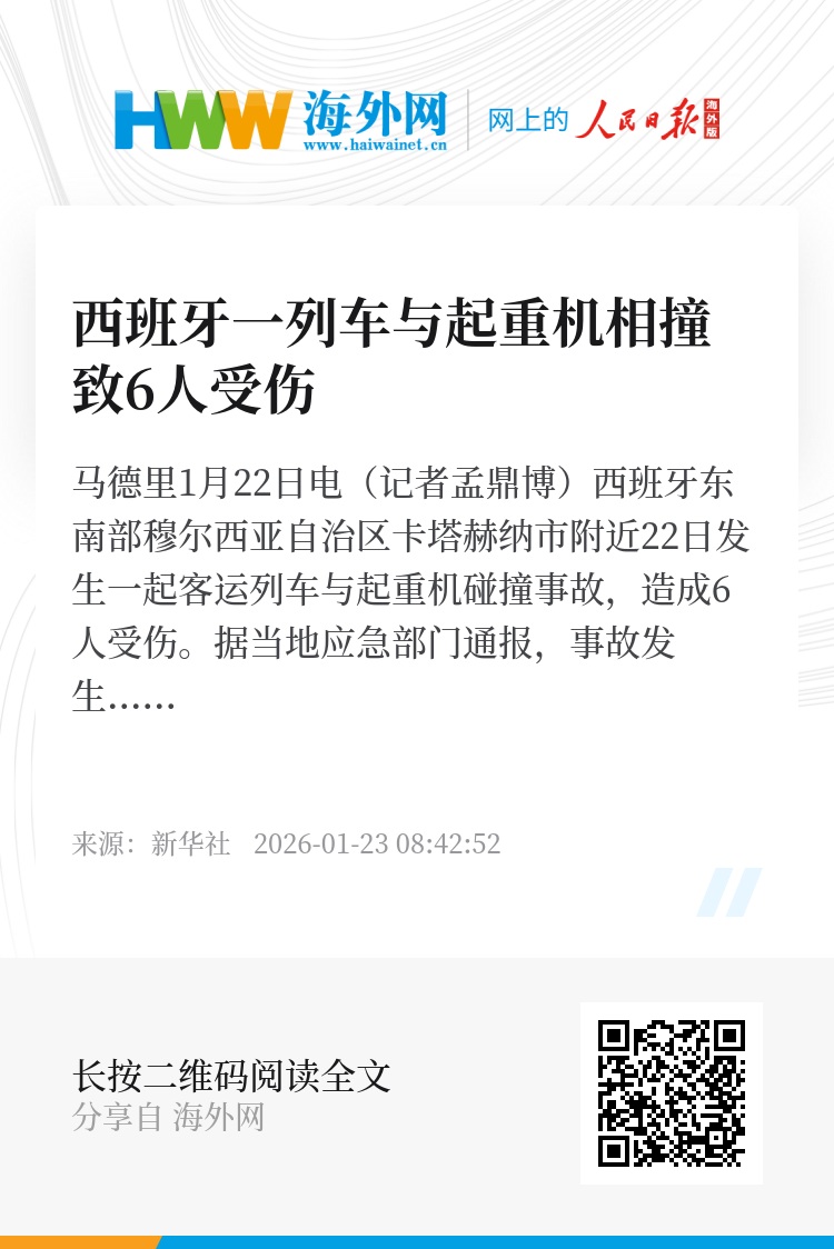 新华社马德里1月22日电(记者孟鼎博)西班牙东南部穆尔西亚自治区卡塔赫纳市附近22日发生一起客运列车与起重机碰撞事故,造成6人受伤。