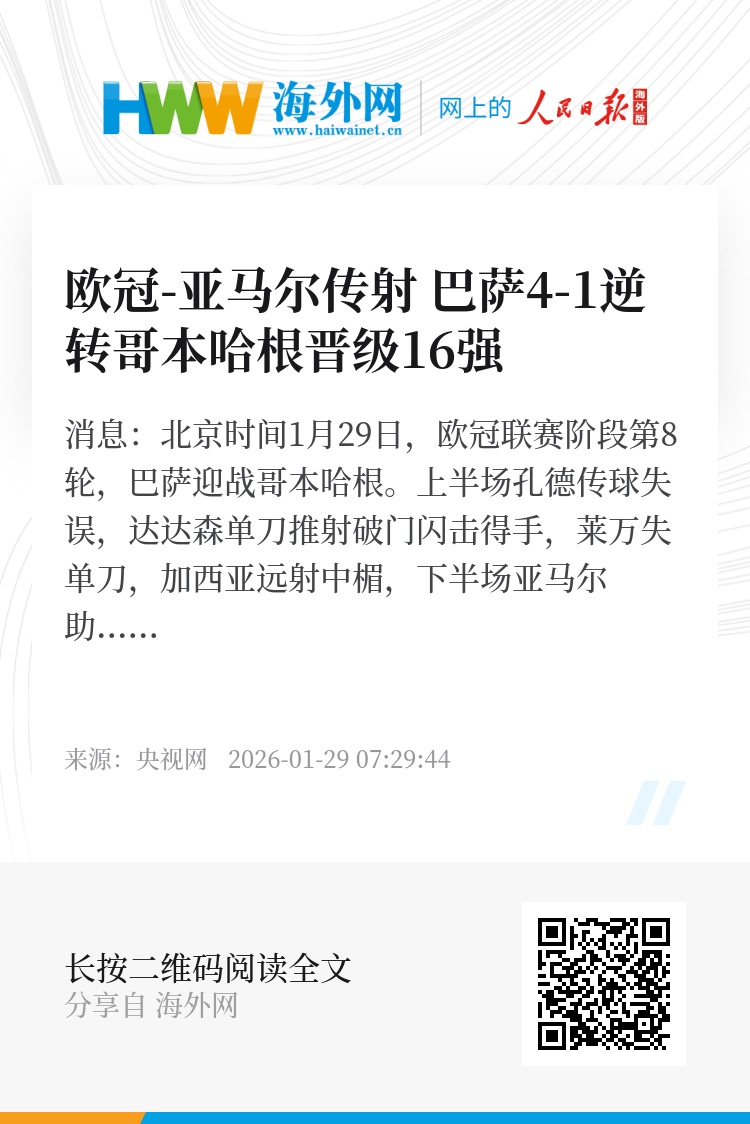 央视网消息:北京时间1月29日,欧冠联赛阶段第8轮,巴萨迎战哥本哈根。上半场孔德传球失误,达达森单刀推射破门闪击得手,莱万失单刀,加西亚远射中楣,下半场亚马尔助攻莱万推射扳平比分,随后亚马尔兜射破门反超比分,莱万造点,拉菲尼亚点射破门,拉什福德定位球破门随后远射中楣,最终巴萨4-1逆转哥本哈根直通16强,巴萨排名欧冠联赛阶段第5,哥本哈根排名第29无缘附加赛遭淘汰。