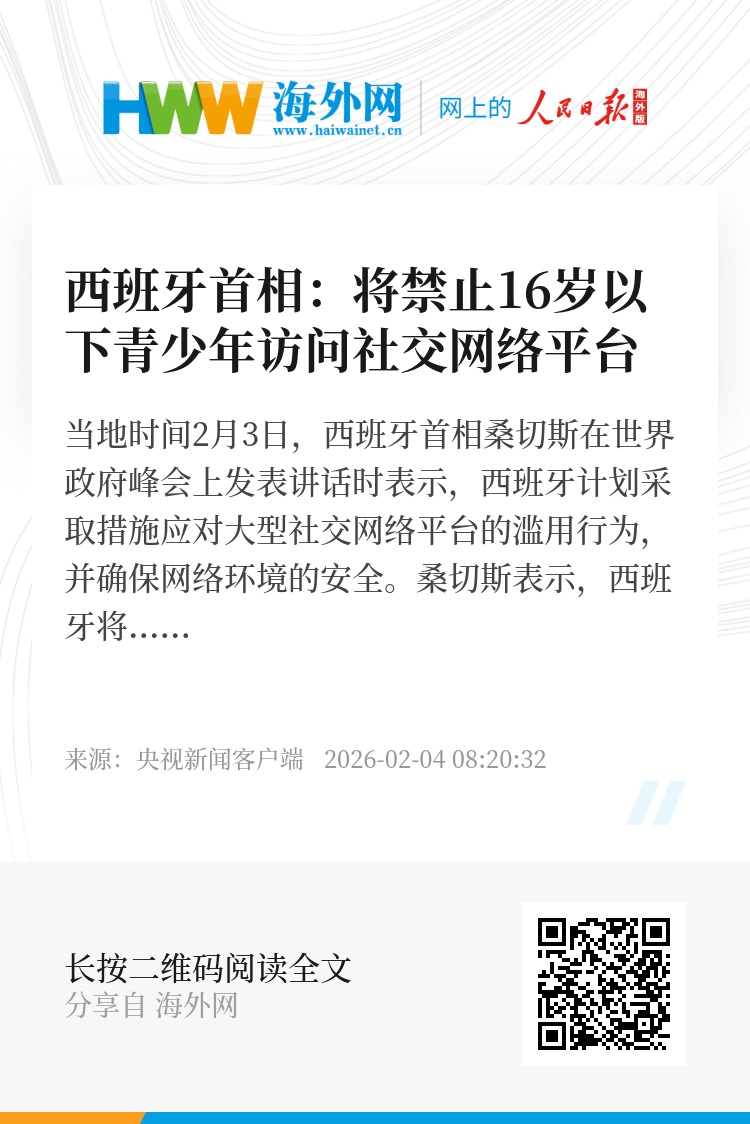 当地时间2月3日,西班牙首相桑切斯在世界政府峰会上发表讲话时表示,西班牙计划采取措施应对大型社交网络平台的滥用行为,并确保网络环境的安全。桑切斯表示,西班牙将禁止16岁以下青少年访问社交网络平台,并要求平台实施有效年龄验证系统。