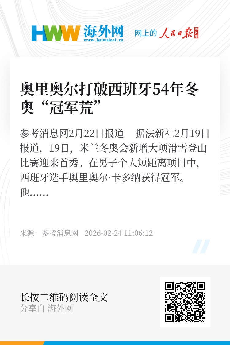 另据西班牙《世界报》网站2月19日报道,19日,西班牙选手奥里奥尔·卡多纳夺得米兰-科尔蒂纳冬奥会滑雪登山项目男子个人短距离比赛冠军,打破了西班牙54年来的冬奥会“冠军荒”。