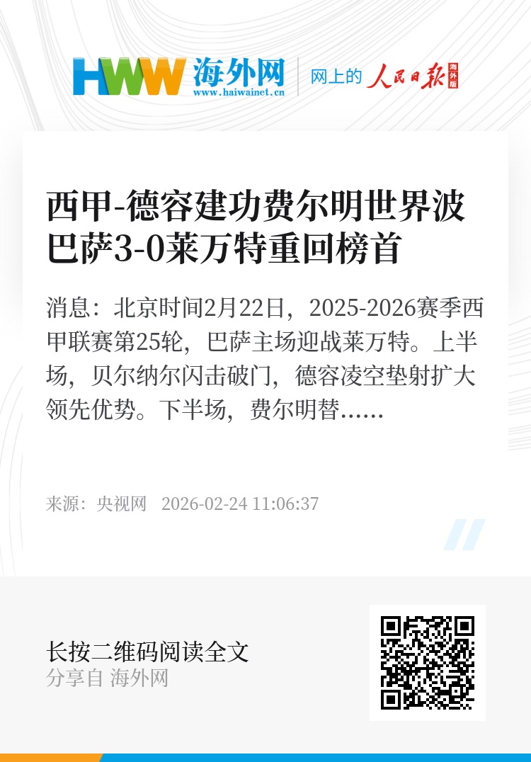 央视网消息:北京时间2月22日,2025-2026赛季西甲联赛第25轮,巴萨主场迎战莱万特。上半场,贝尔纳尔闪击破门,德容凌空垫射扩大领先优势。下半场,费尔明替补登场攻入世界波锁定胜局。最终,巴萨主场3-0完胜莱万特,积61分重回西甲榜首。
