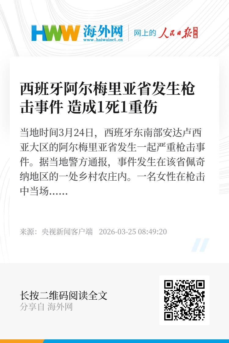 当地时间3月24日,西班牙东南部安达卢西亚大区的阿尔梅里亚省发生一起严重枪击事件。据当地警方通报,事件发生在该省佩奇纳地区的一处乡村农庄内。一名女性在枪击中当场身亡,另有一名男性受重伤,已被紧急送往当地医院抢救。