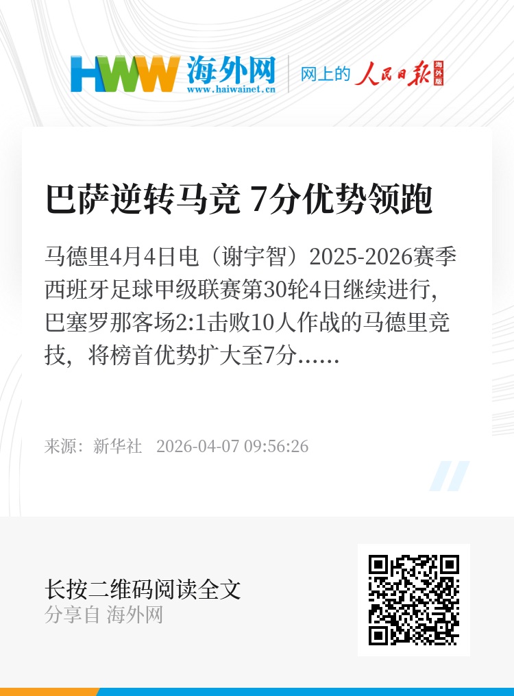 新华社马德里4月4日电(谢宇智)2025-2026赛季西班牙足球甲级联赛第30轮4日继续进行,巴塞罗那客场2:1击败10人作战的马德里竞技,将榜首优势扩大至7分。