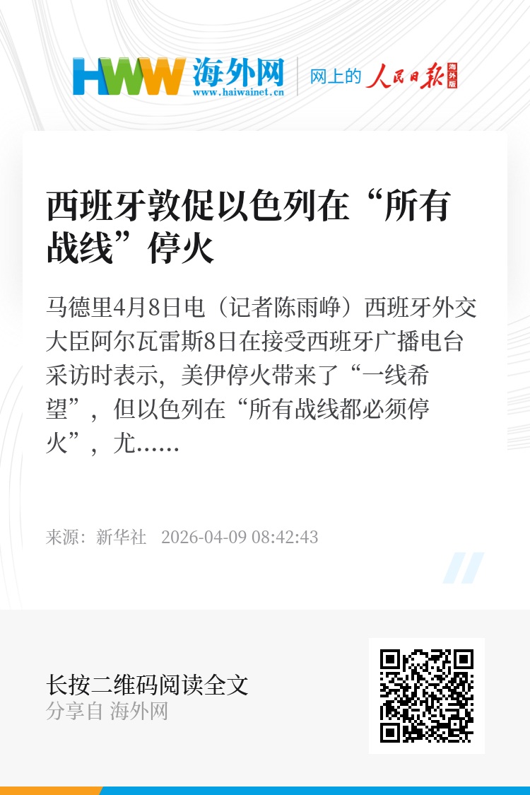 新华社马德里4月8日电(记者陈雨峥)西班牙外交大臣阿尔瓦雷斯8日在接受西班牙广播电台采访时表示,美伊停火带来了“一线希望”,但以色列在“所有战线都必须停火”,尤其是在黎巴嫩。