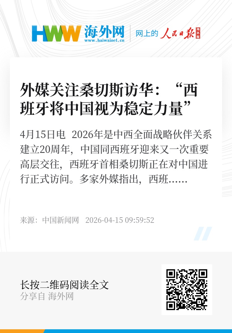 中新网4月15日电 2026年是中西全面战略伙伴关系建立20周年,中国同西班牙迎来又一次重要高层交往,西班牙首相桑切斯正在对中国进行正式访问。多家外媒指出,西班牙将中国视为“稳定力量”,在全球不确定性日益加剧的当下,两国将推动双边关系稳步发展,携手应对全球性挑战。